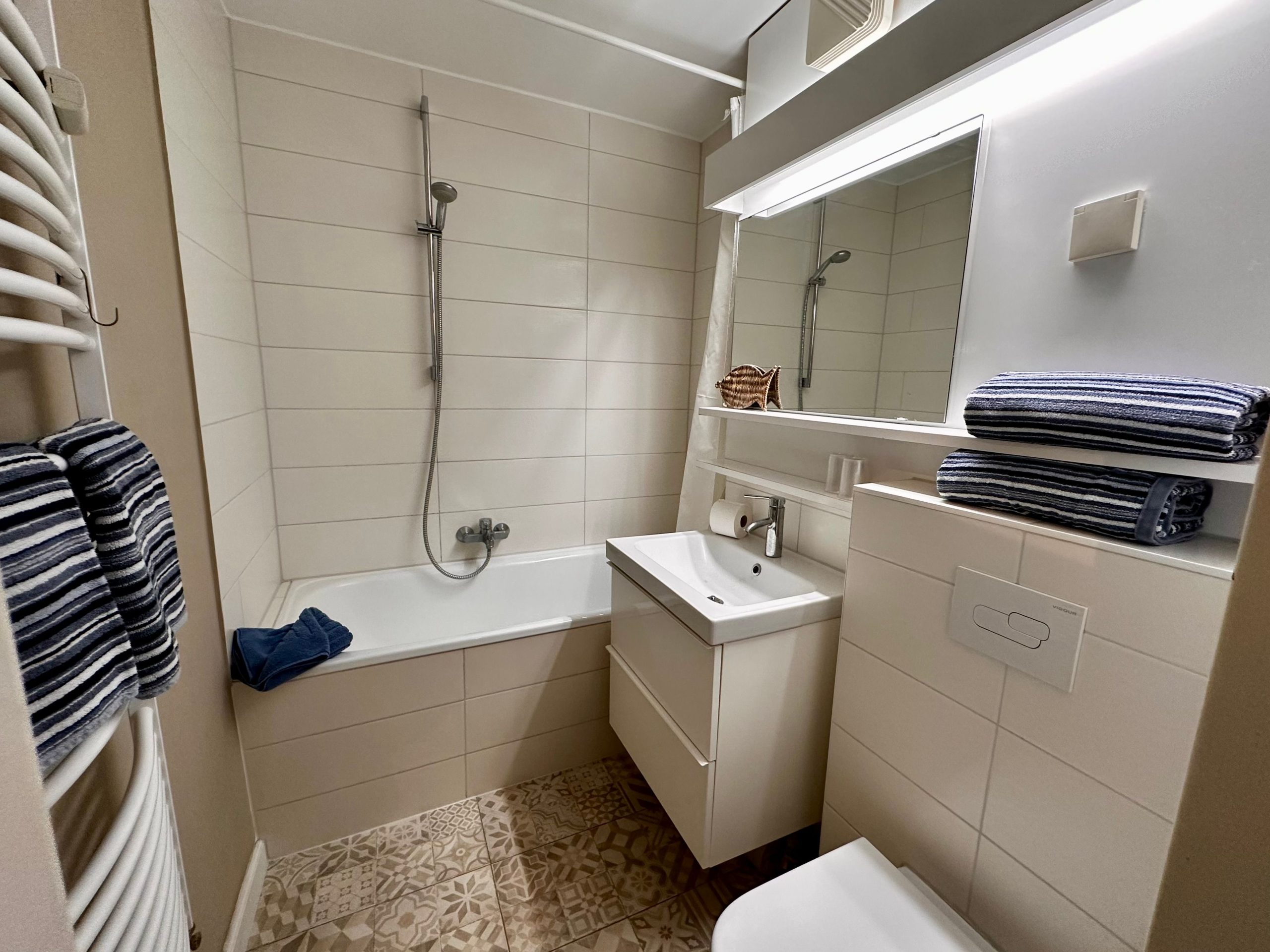 Die Wohnung ist hochwertig und geschmackvoll eingerichtet, sodass du dich sofort wie zu Hause fühlen wirst. In den gemütlichen Schlafzimmern finden je zwei Gäste Platz (eines mit offener Verbindung zum Wohnzimmer).