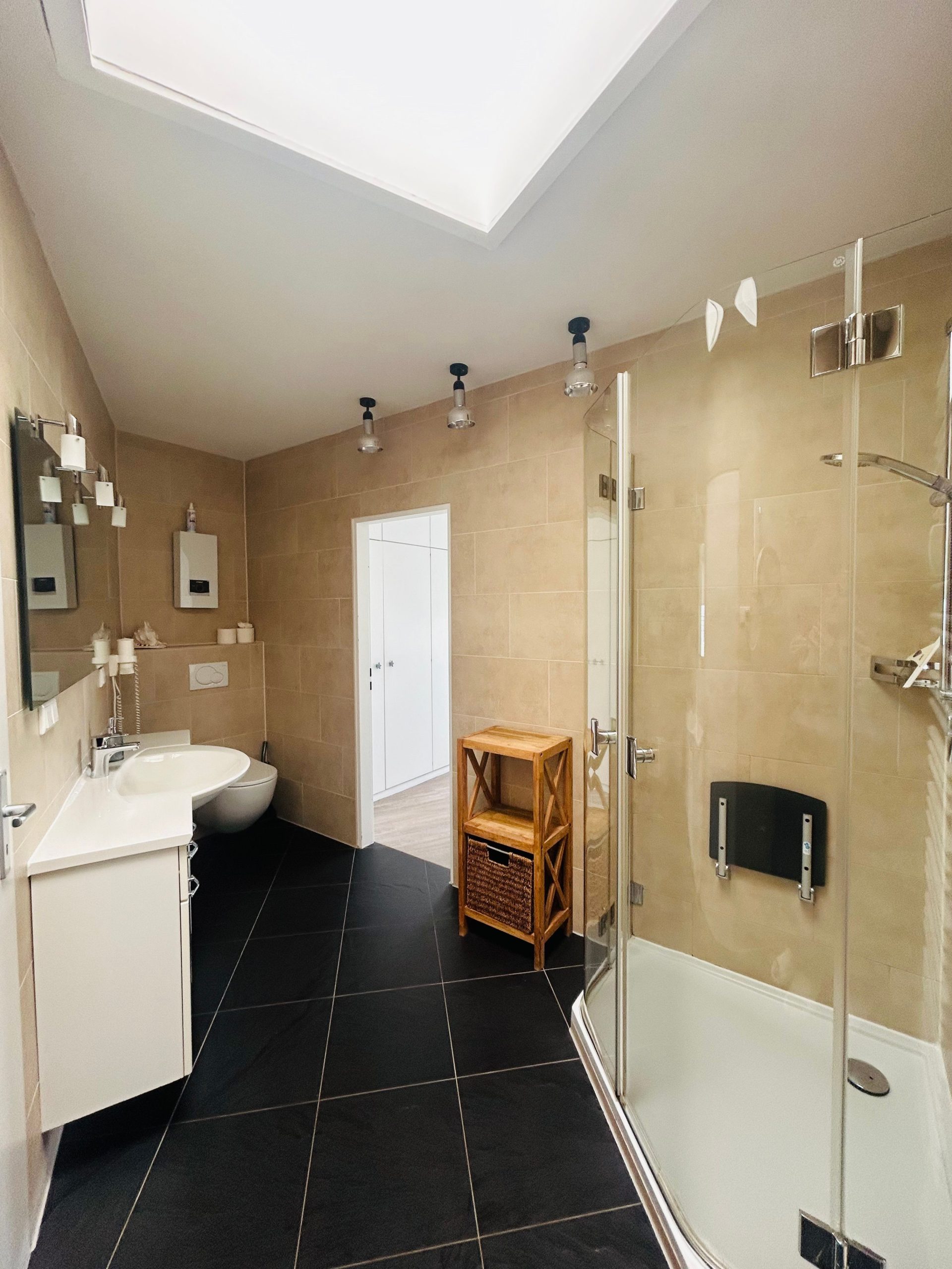 Das Badezimmer bietet dir eine erfrischende Dusche und moderne Annehmlichkeiten, sodass du dich nach einem langen Tag am Strand entspannen kannst. Und keine Sorge, saubere Kleidung ist garantiert, denn sowohl eine Waschmaschine als auch ein Trockner stehen zur gemeinschaftlichen Nutzung zur Verfügung.