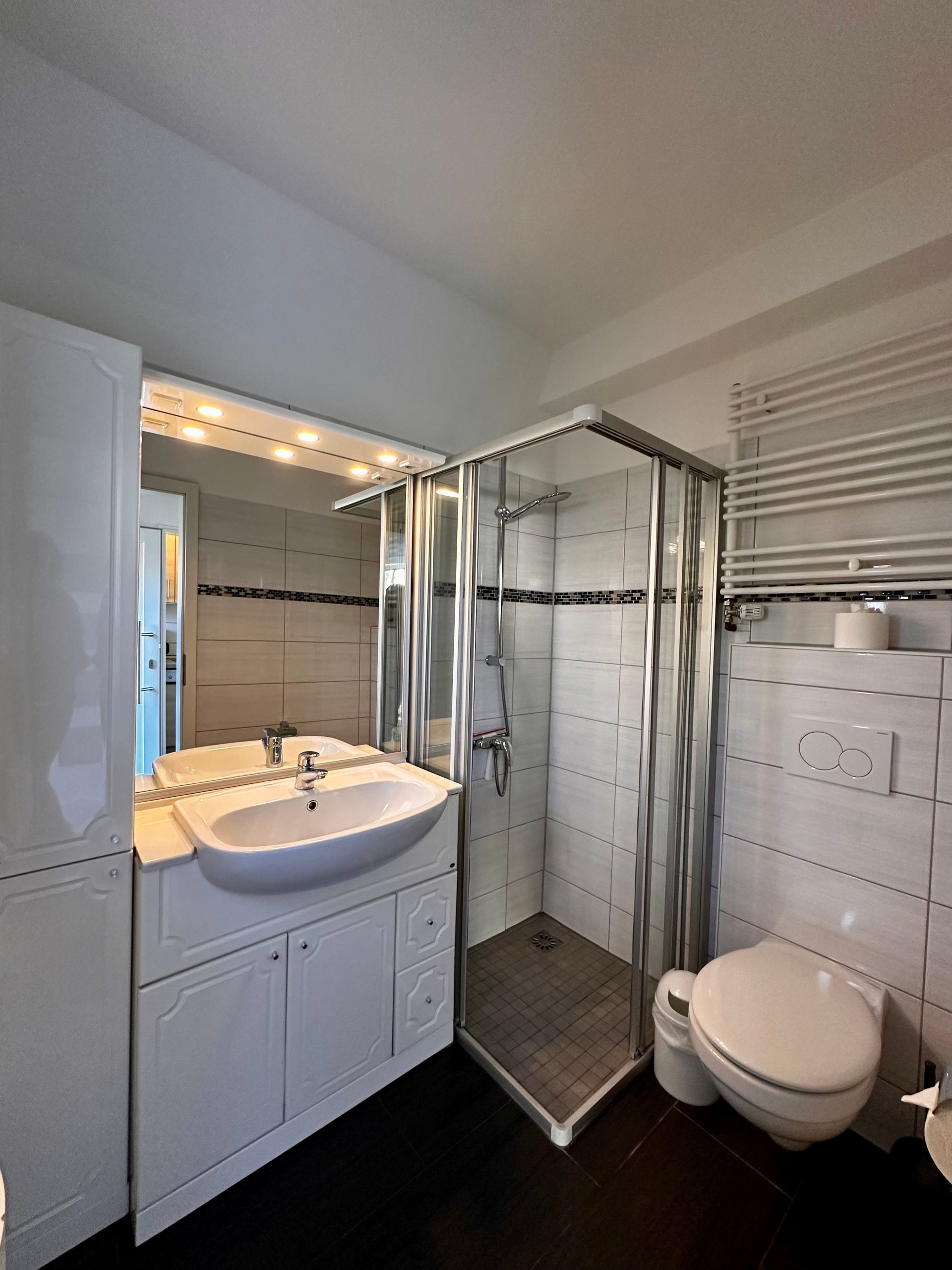 Im Haus befindet sich ein Badezimmer mit Dusche, WC, Waschbecken und Spiegel. Ein Haartrockner sowie ein Wäscheständer sind ebenfalls vorhanden.