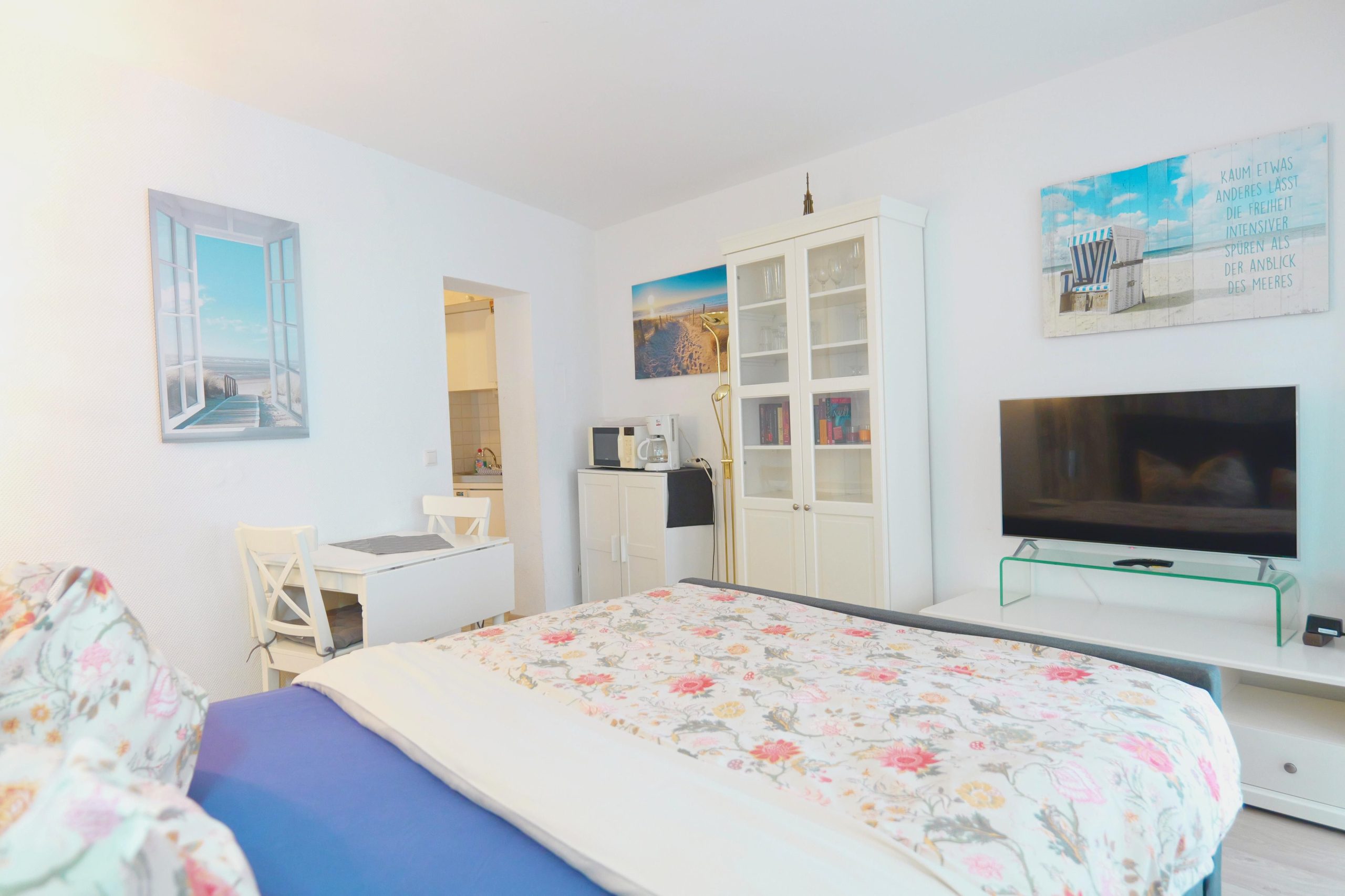 Die Ferienwohnung verfügt über einen geschützten/geschlossenen Balkon (Wintergarten), der dir einen angenehmen Ort zum Verweilen bietet. Der Schlaf-/Wohnbereich ist mit einem bequemen Bett, einem Esstisch, TV und kostenfreiem WLAN ausgestattet. Die funktionale Kochnische ist mit einem 2-Platten-Herd, Kühlschrank, Kaffeemaschine, Toaster, Wasserkocher sowie diversen Küchenutensilien ausgestattet, was die Selbstversorgung unkompliziert und angenehm gestaltet.